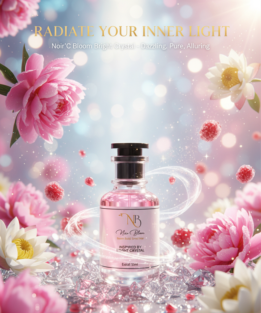 Noir Bloom – Bright Crystal: A sparkling mix of fresh peony, pomegranate, and amber that embodies pure elegance and radiant confidence.